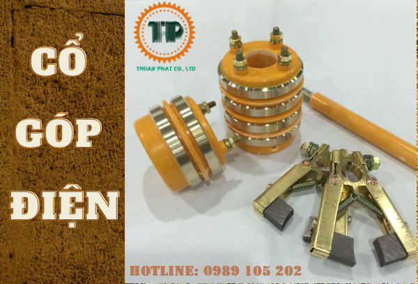 Cổ góp điện 2 pha gồm: 1 vành góp hình trụ tròn có 2 vành đồng quấn quanh, 4 lá than, 2 kẹp giá đỡ, 1 cây ty.