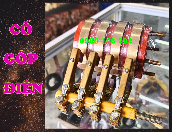 - Cổ góp điện 10 pha gồm: 1 vành góp hình trụ tròn có 10 vành đồng quấn quanh, 20 lá than, 10 kẹp giá đỡ, 1 cây ty.