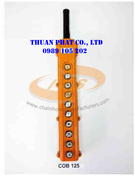 - Nút bấm điều khiển cầu trục loại 10 nút bao gồm: nút để nâng lên, nút để hạ xuống, nút chạy qua, nút chạy lại, nút chạy tới, nút chạy lui, cùng với một nút khẩn cấp để dừng lại. Loại này có thể điều khiển song song 2 palang của cầu trục.